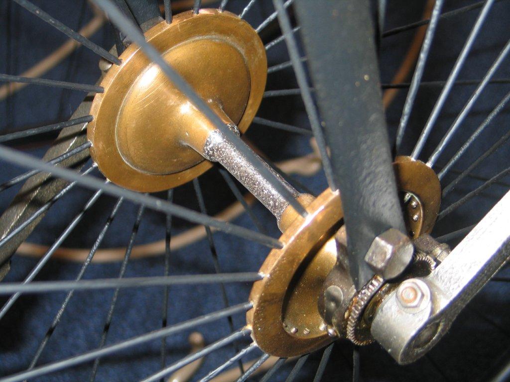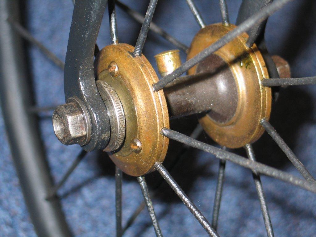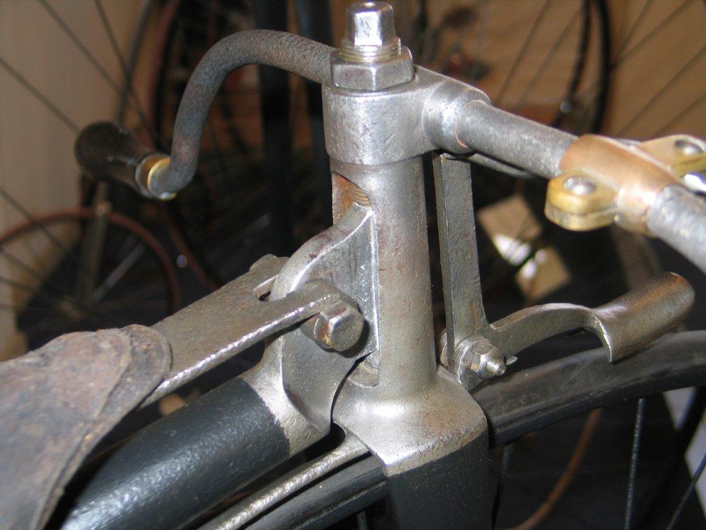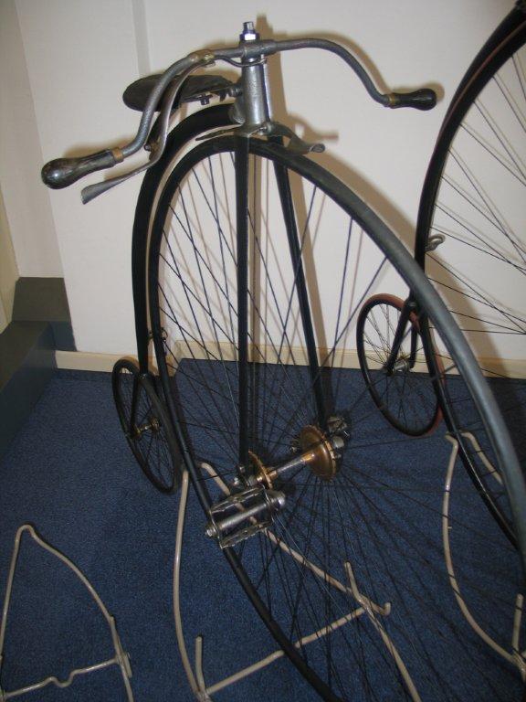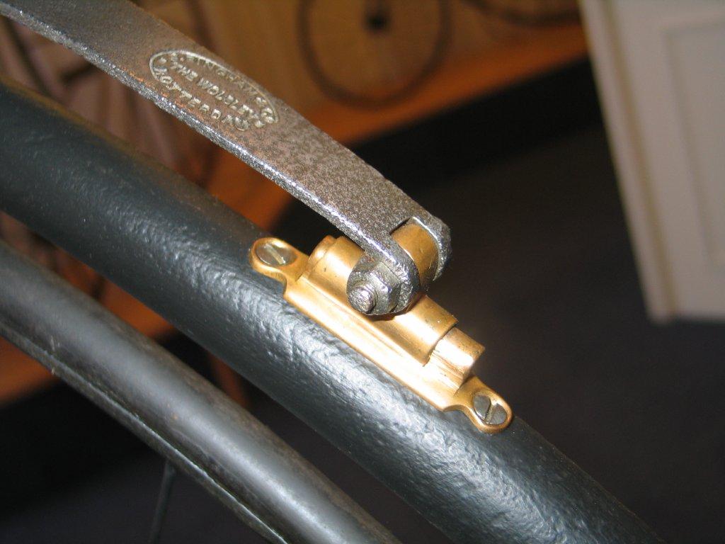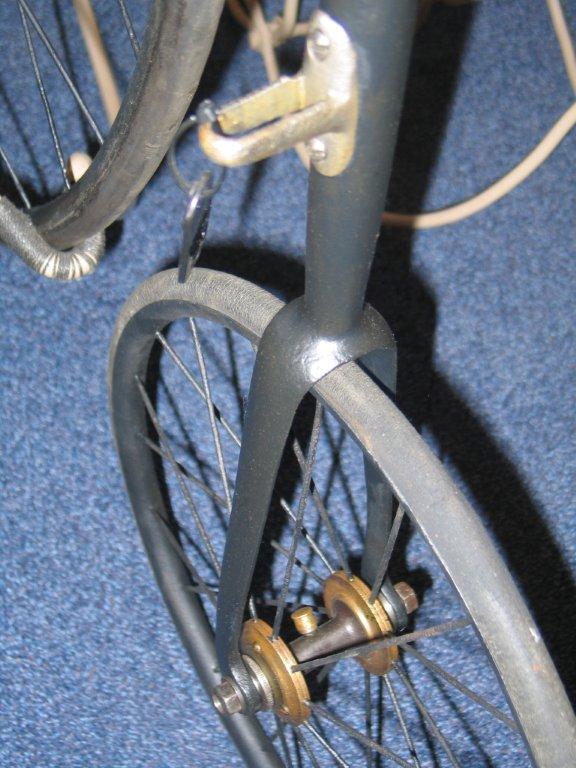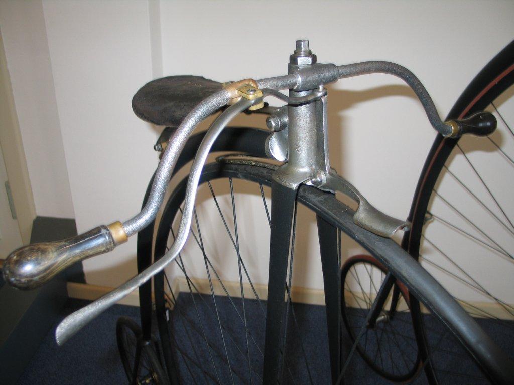 Original Dutch ordinaries are very rare, but this Bingham 'The Wolsley', here seen on display in the Velorama Museum, is one of them. It is a straightforward penny farthing, nothing really special about it. Ball bearings front and rear, beautiful horn grips, hollow front fork. It's got Bown Aeolus bearings at the front and the bike was surely built in the UK. Bingham gave it his own mark, as seen on the spring. I guess it was built between 1885 en 1890.